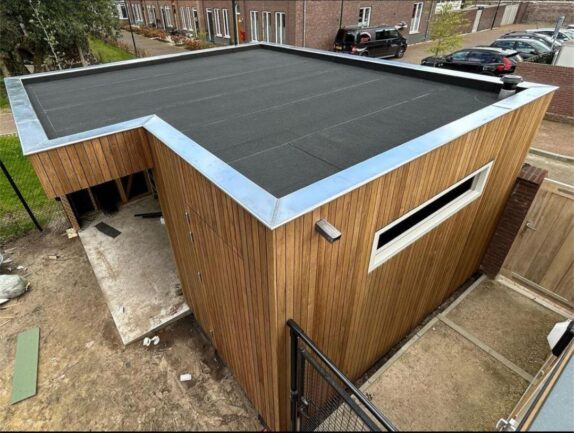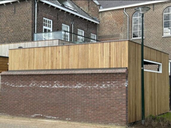 Deze vrijstaande tuinkamer met inpandige berging is voorzien van Thermo Fraké boards 20×64 mm. De verticale montage zorgt voor een strak en modern lijnenspel. De tuinkamer en berging stralen een warme en natuurlijke sfeer uit.